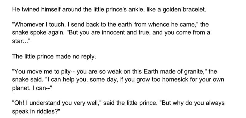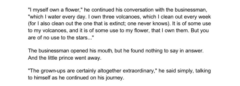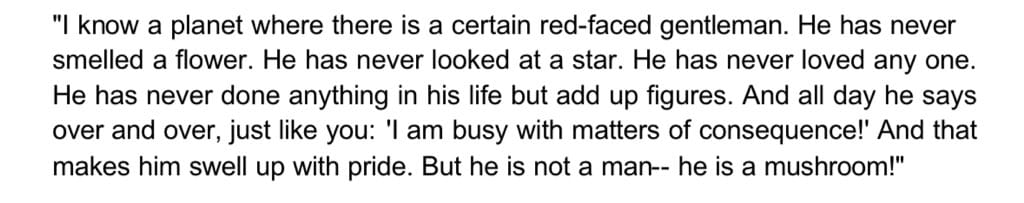 - Presents a strong case for chasing fulfillment over materialism. As is clear with the planets The Little Prince visits, there is more to life than material - and the day-to-day struggle that most adults face. It makes a compelling and novel argument that really hits home compared to others who "just say it" – this makes you "feel it."